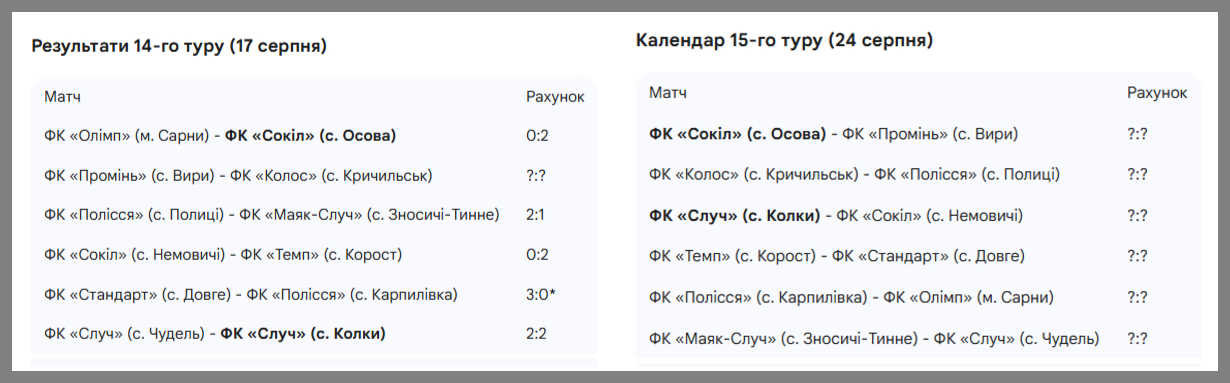 - лідери чемпіонату, ФК «Сокіл» (с. Осова), прийматиме вдома вищезгаданих ФК «Промінь» (с. Вири). У першому матчі «соколята» розгромили гостей із рахунком 6:1;