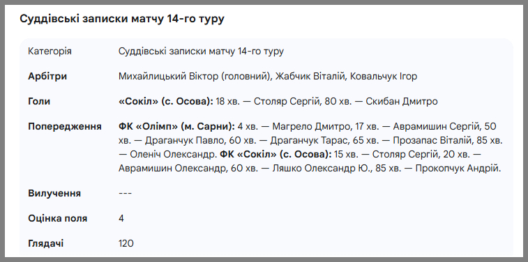 Лідери чемпіонату, ФК «Сокіл» (с. Осова), здобули виїзну перемогу над ФК «Олімп» (м. Сарни). Проте матч виявився надзвичайно напруженим і супроводжувався численними зіткненнями між гравцями, що призвело до великої кількості попереджень. Післяматчева суддівська записка зафіксувала: 10 жовтих карток (6 – для футболістів «Олімпу», 4 – для «Сокола»).