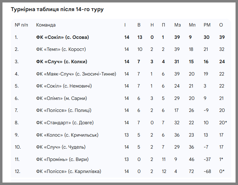За підсумками матчу, ФК «Сокіл» (с. Осова) і далі впевнено очолює чемпіонат, маючи в активі 39 очок (13 перемог, 0 нічиїх, 1 поразка, 39 забитих, 9 пропущених).