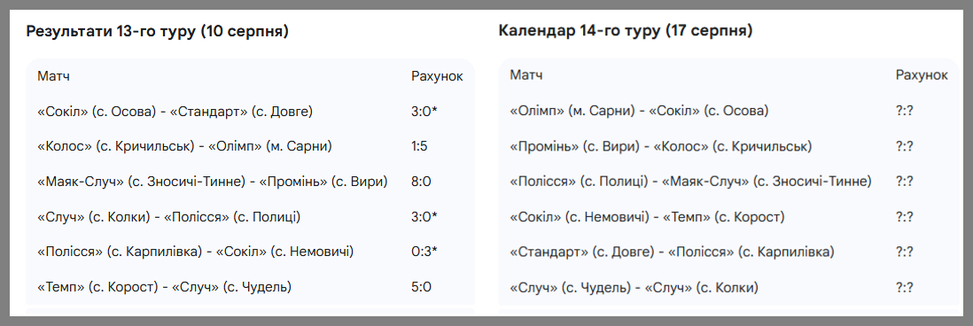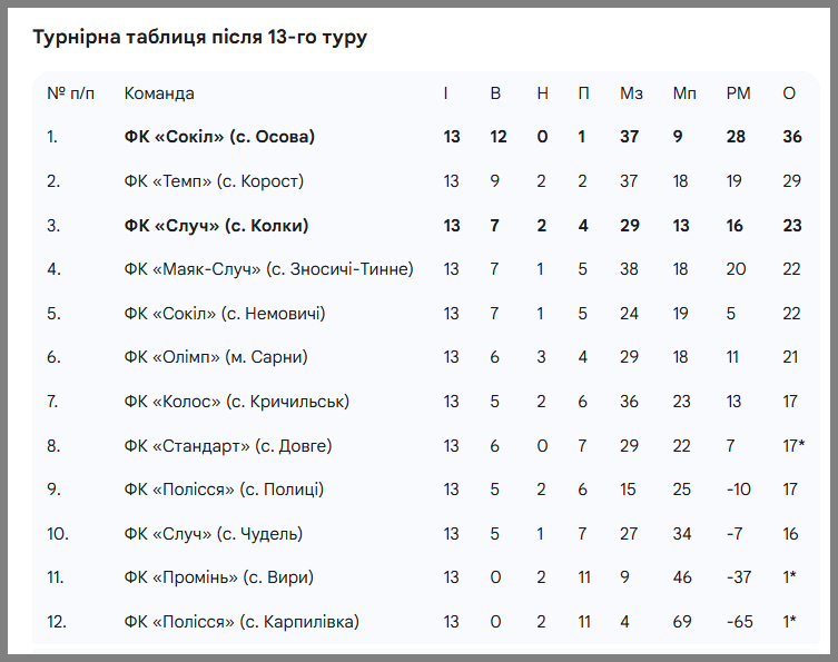 На підсумками 13-го туру, футбольні команди Дубровицької громади міцно тримаються в трійці лідерів: ФК «Сокіл» впевнено очолює чемпіонат, а «Случ» зберігає за собою третє місце.