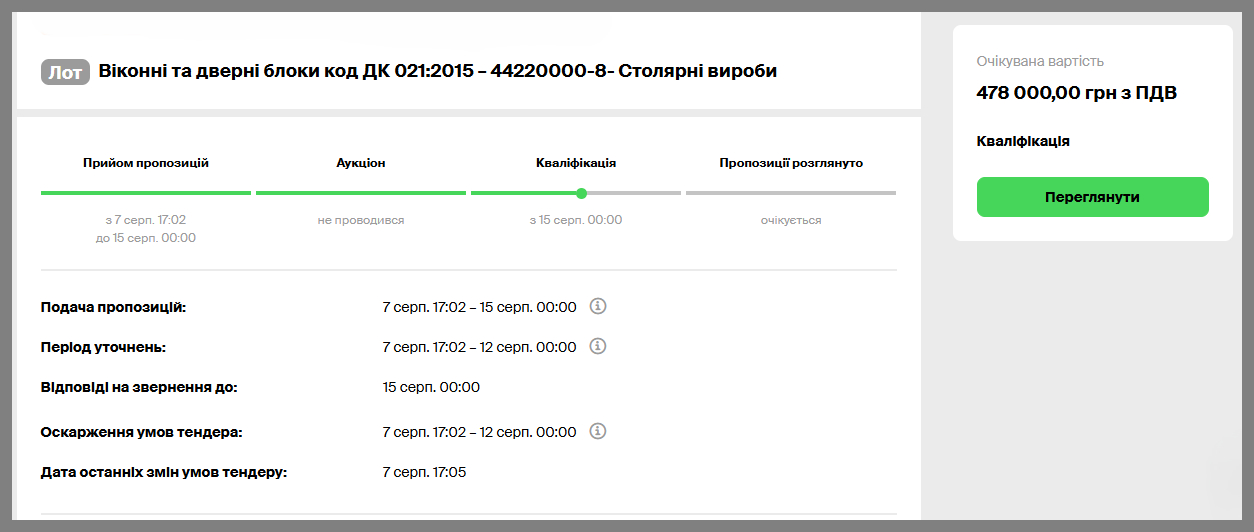 Згідно з поточною інформацією, аукціон не проводився. Наразі триває кваліфікація щодо єдиного учасника – ФОП «Хомич Ірина Анатоліївна», який подав заявку на суму 464 910,94 гривні із ПДВ.